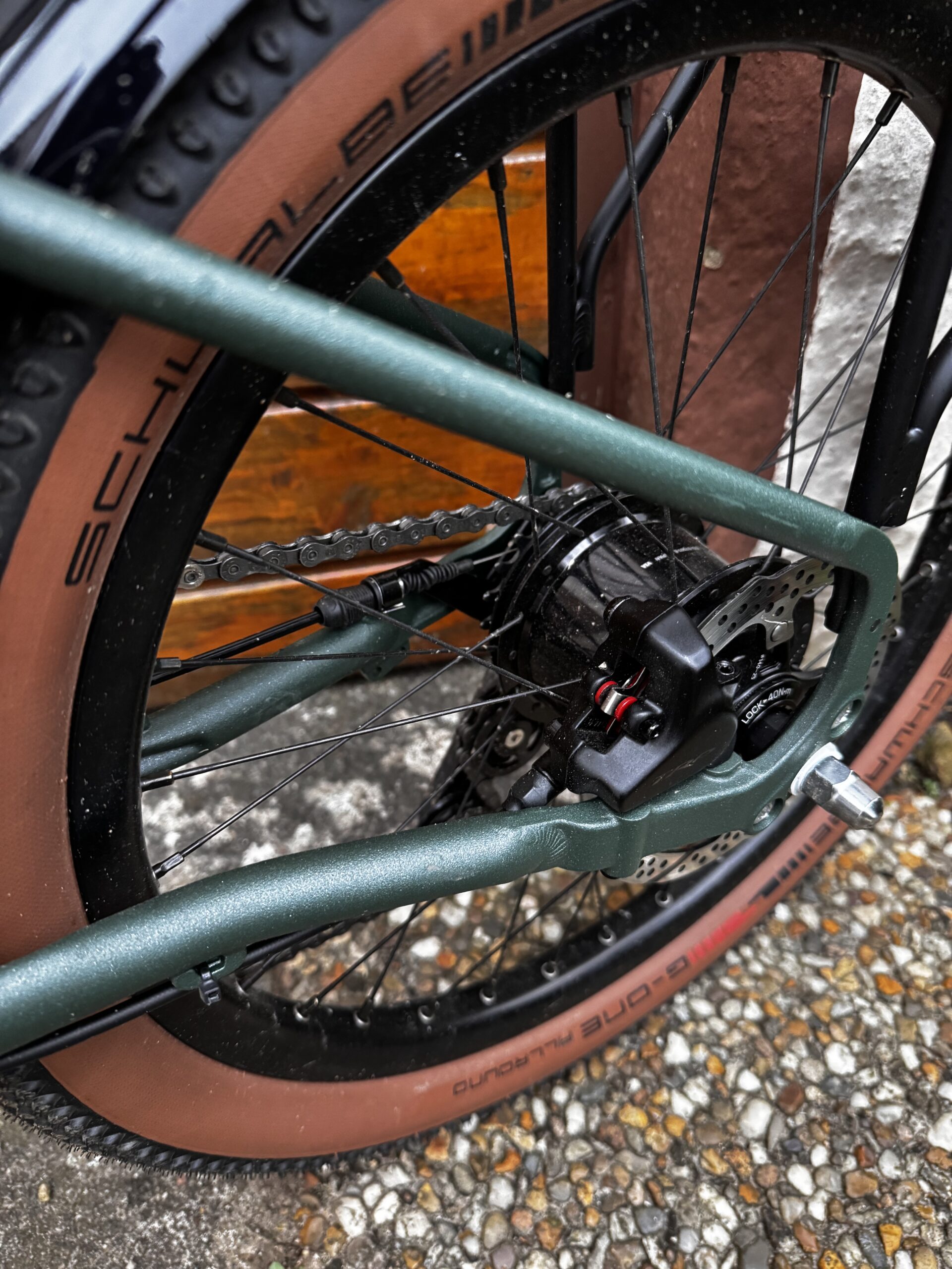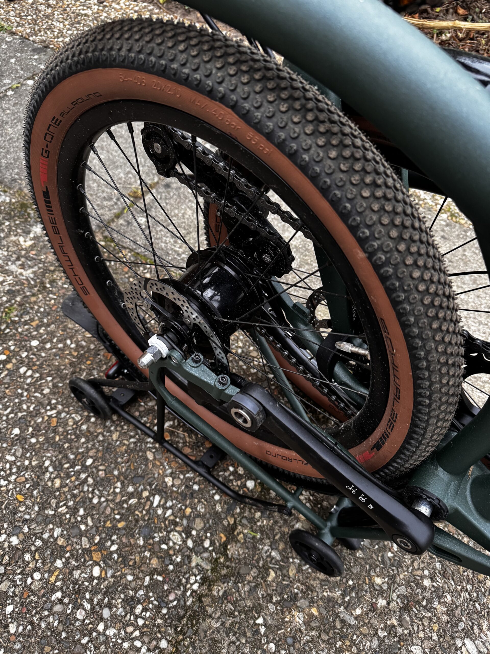 Brompton Bicycles selbst bewirbt das Rad aus ausgewachsenes Fahrrad. Nicht nur, dass es 20 Zoll Räder hat, auf diesen sind 5,4 cm breite Reifen (Schwalbe G-One Allround) aufgezogen. Dicke Schlappen für alle Untergründe! Mit neuen Laufrädern gehen auch neue Bremsmöglichkeiten einher, sodass das Modell nun mit hydraulischen Scheibenbremsen daherkommt, eine grandiose Neuerung!